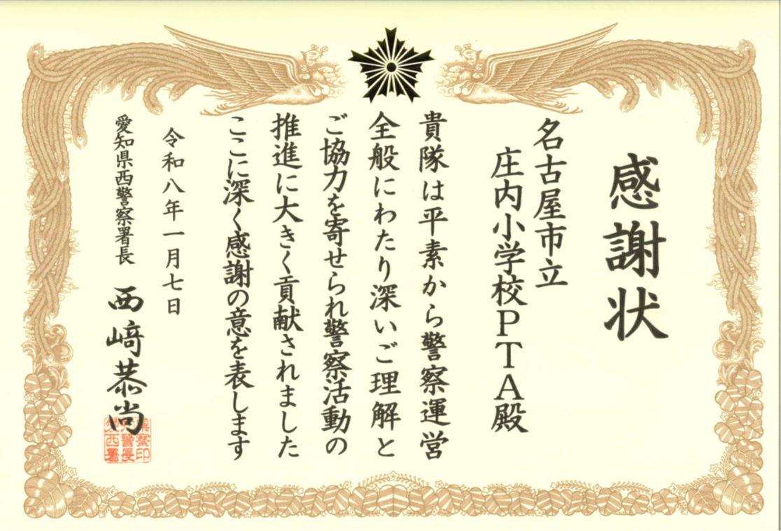 2026.1.7 愛知県西警察署より感謝状を頂きました